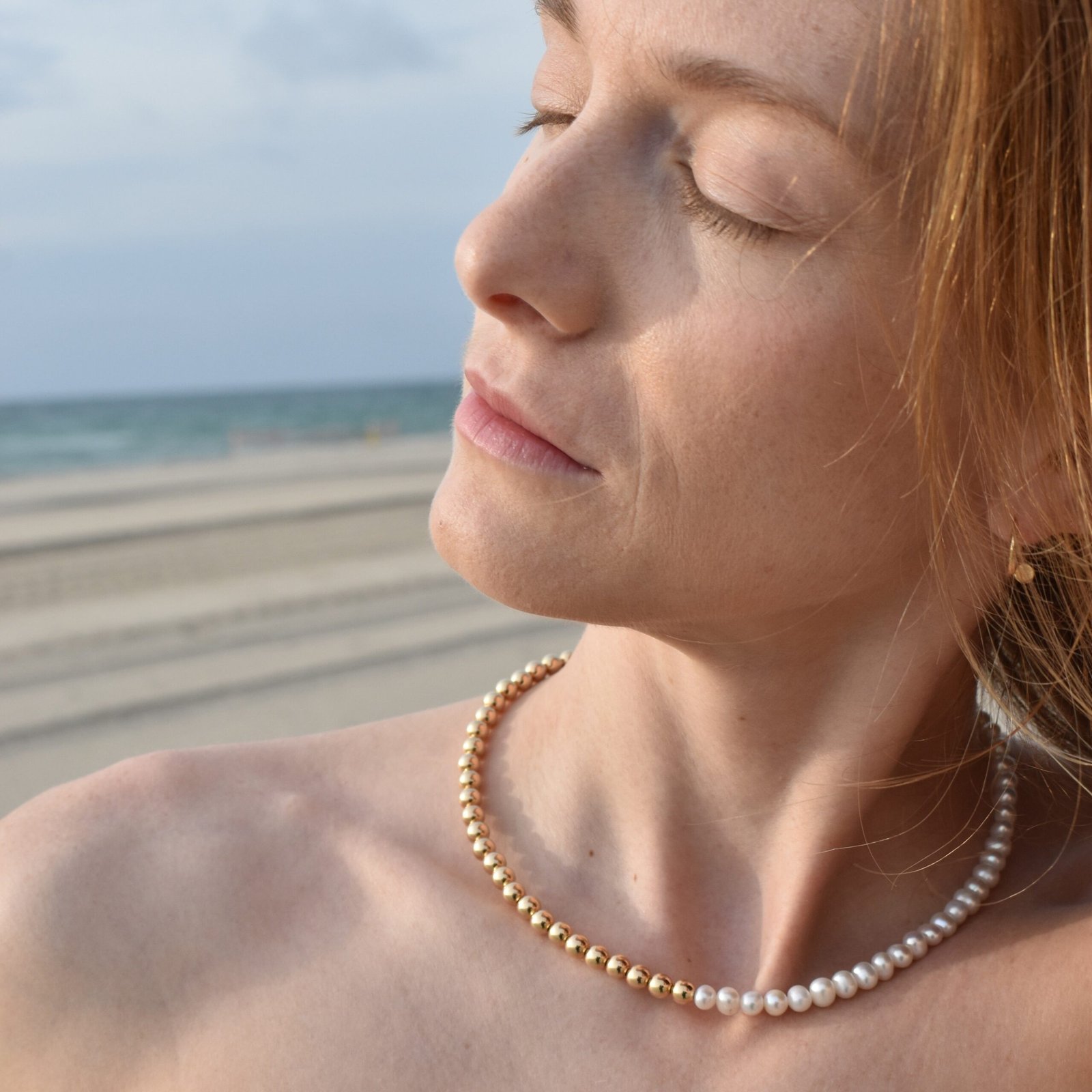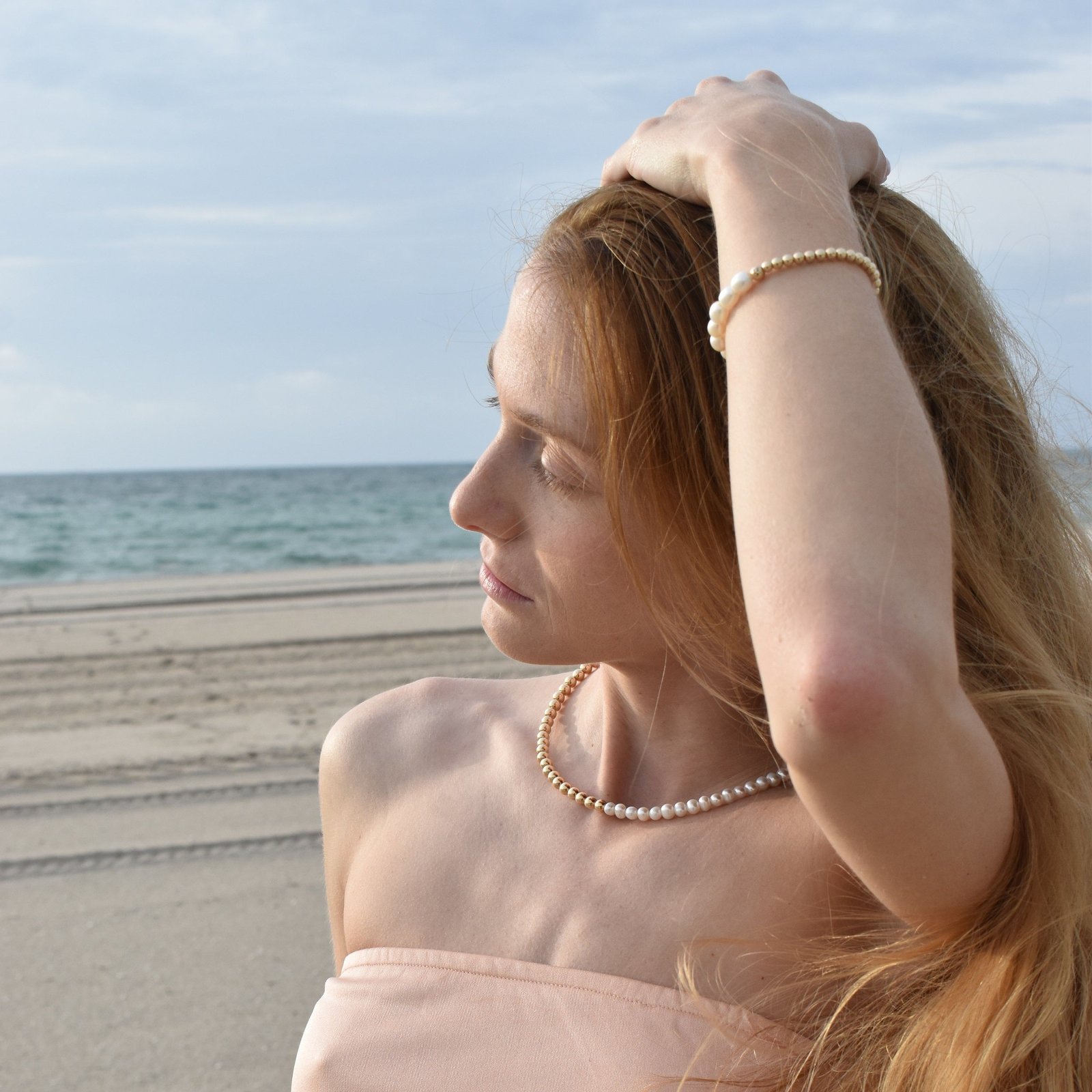 6MM 14K yellow gold beaded necklace for women with pearls on metal wire.