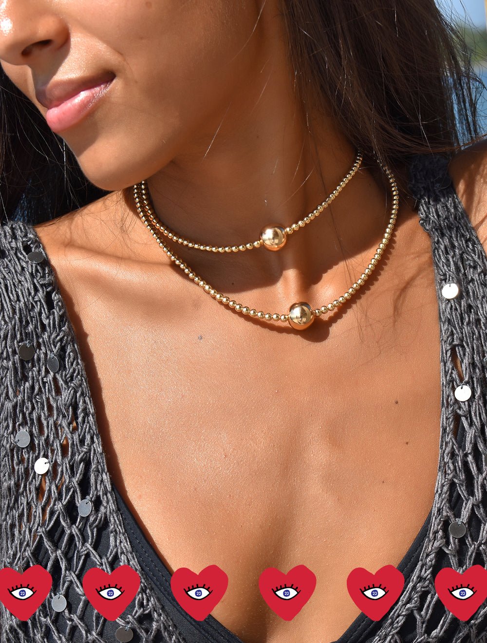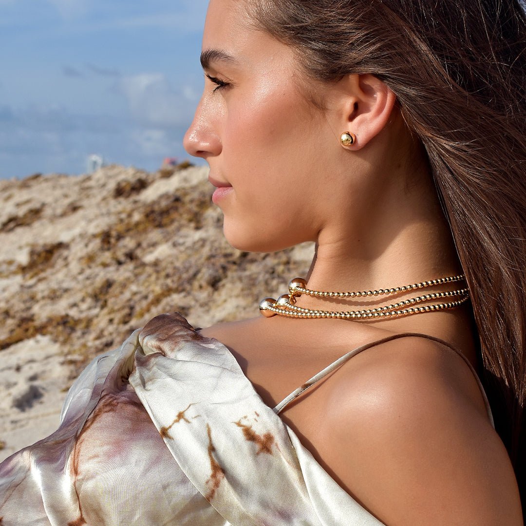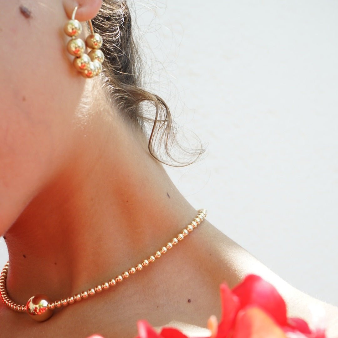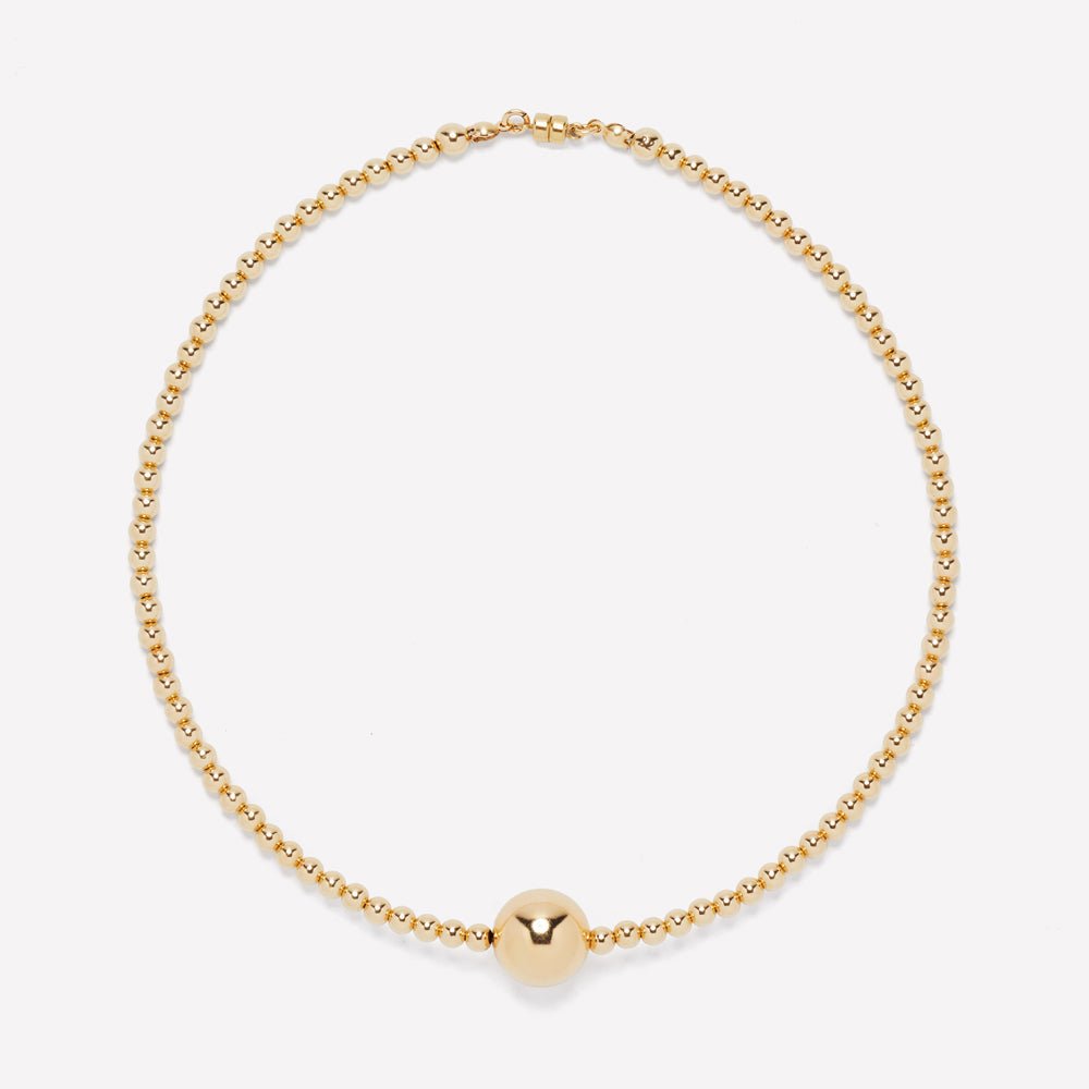 Introducing the KRISTINA NECKLACE: a sophisticated and sleek piece. crafted with handpicked gold beads. With a large gold bead as the focal point in the center. it adds contemporary elegance to every look.