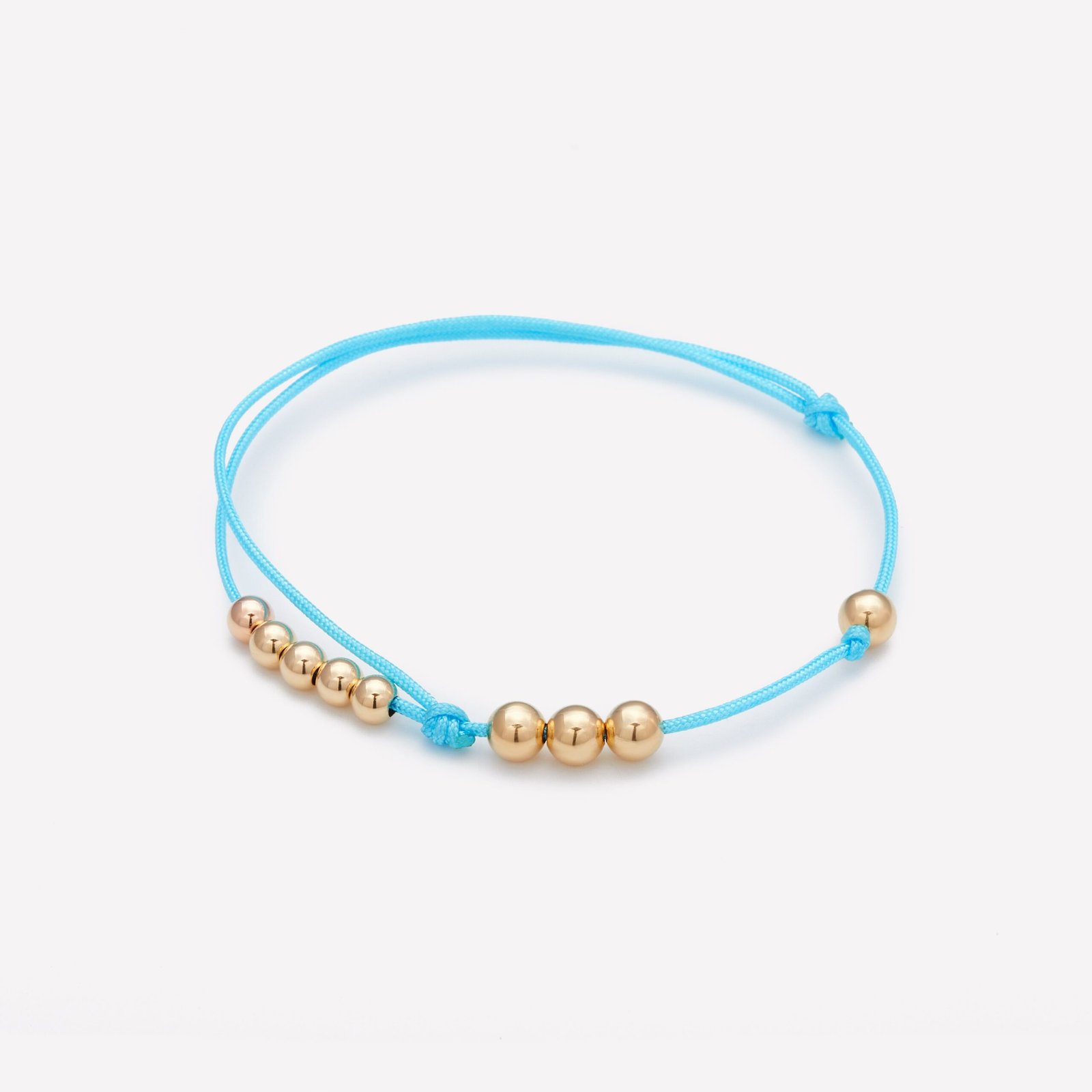 4MM and 5MM 14K yellow gold beads on turquoise silk string bracelet for men and women.