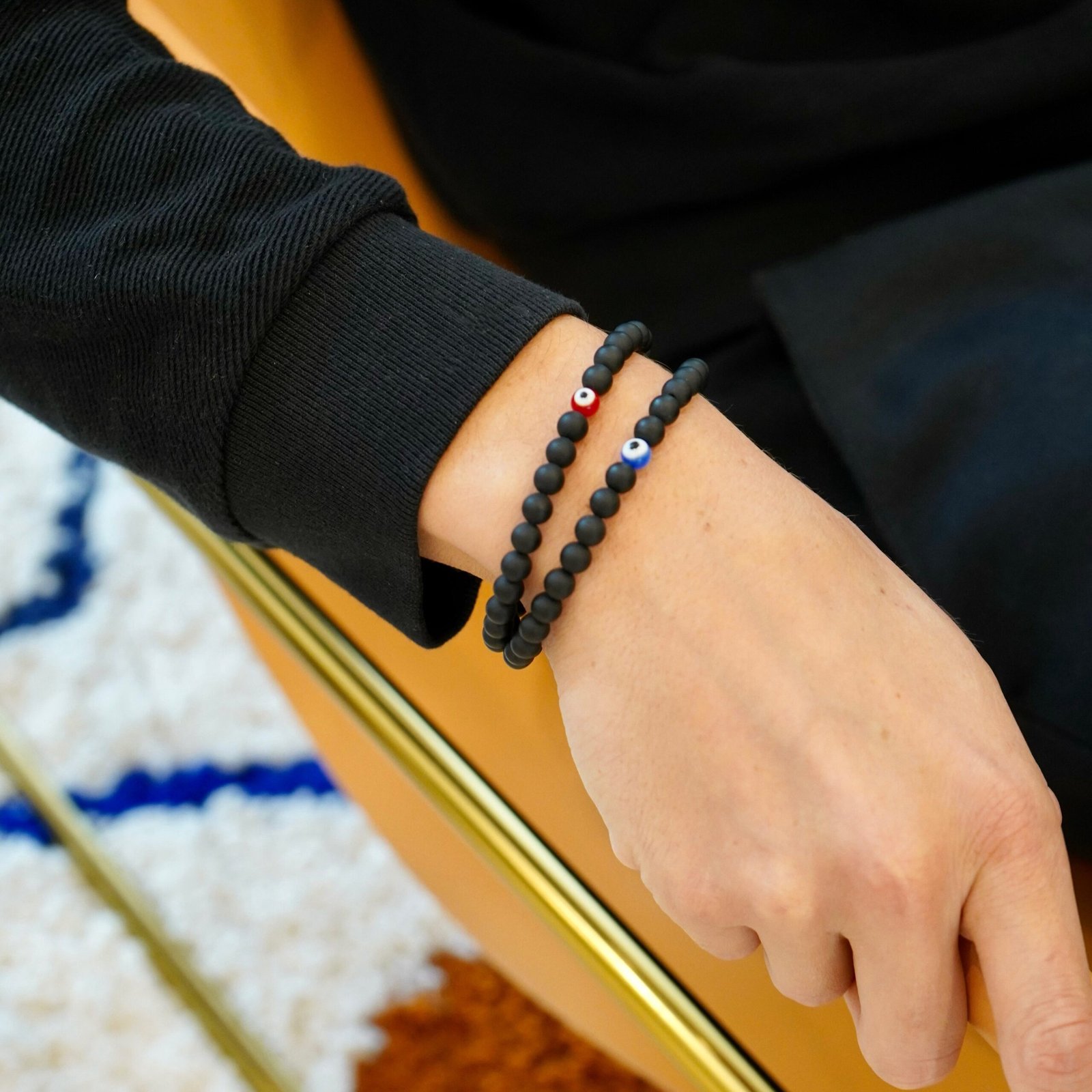 This bold ONYX ATHENA BRACELET stands out with its captivating onyx beading and striking glass evil eye bead. This men's bracelet. with its timeless stitching and intricate design. is sure to make an exclusive statement in any wardrobe.