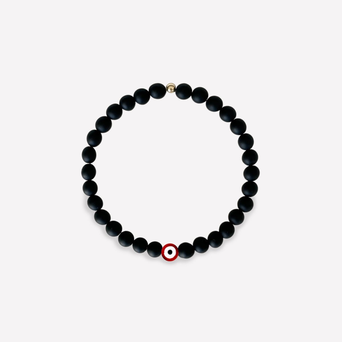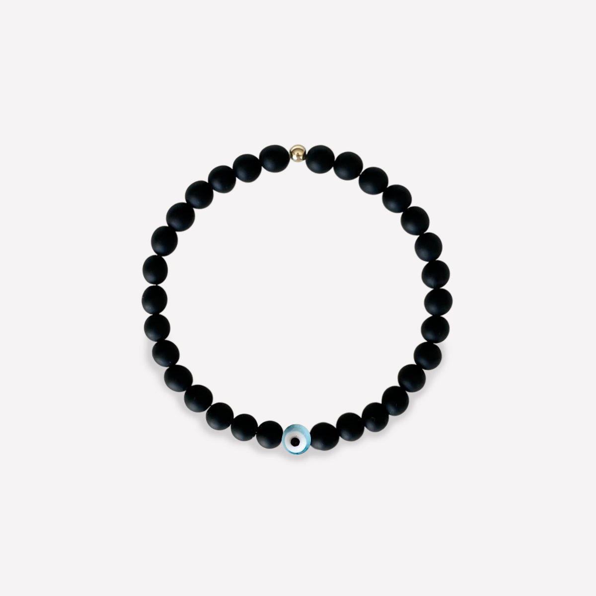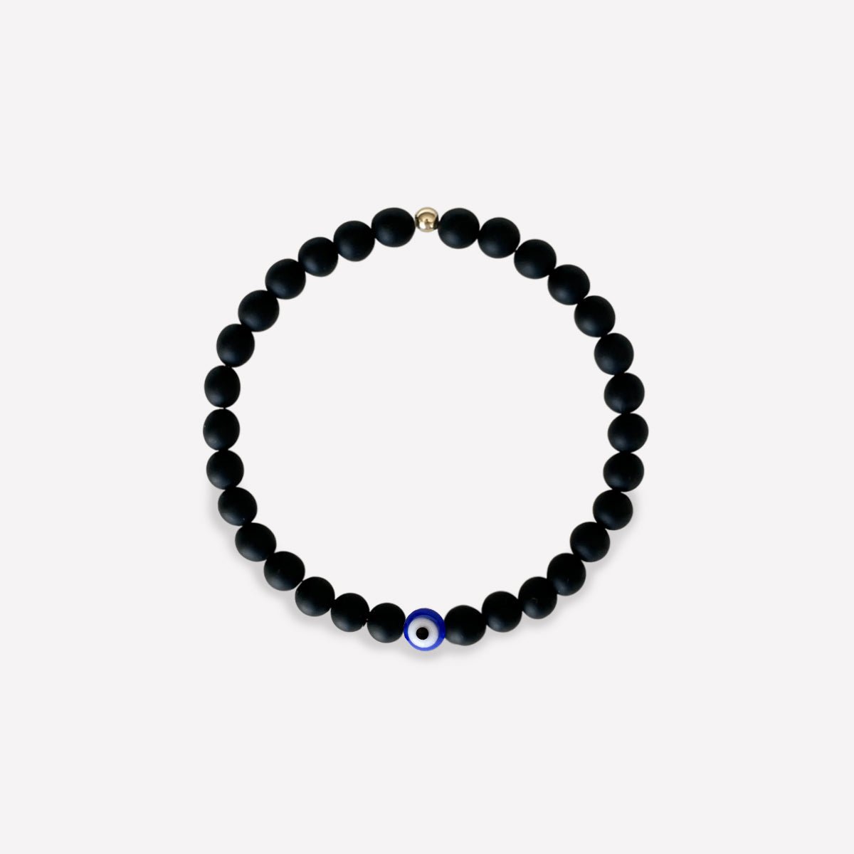 6MM black matte onyx beaded bracelet for men with glass evil eye on clear elastic.
