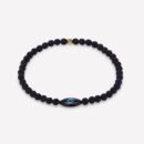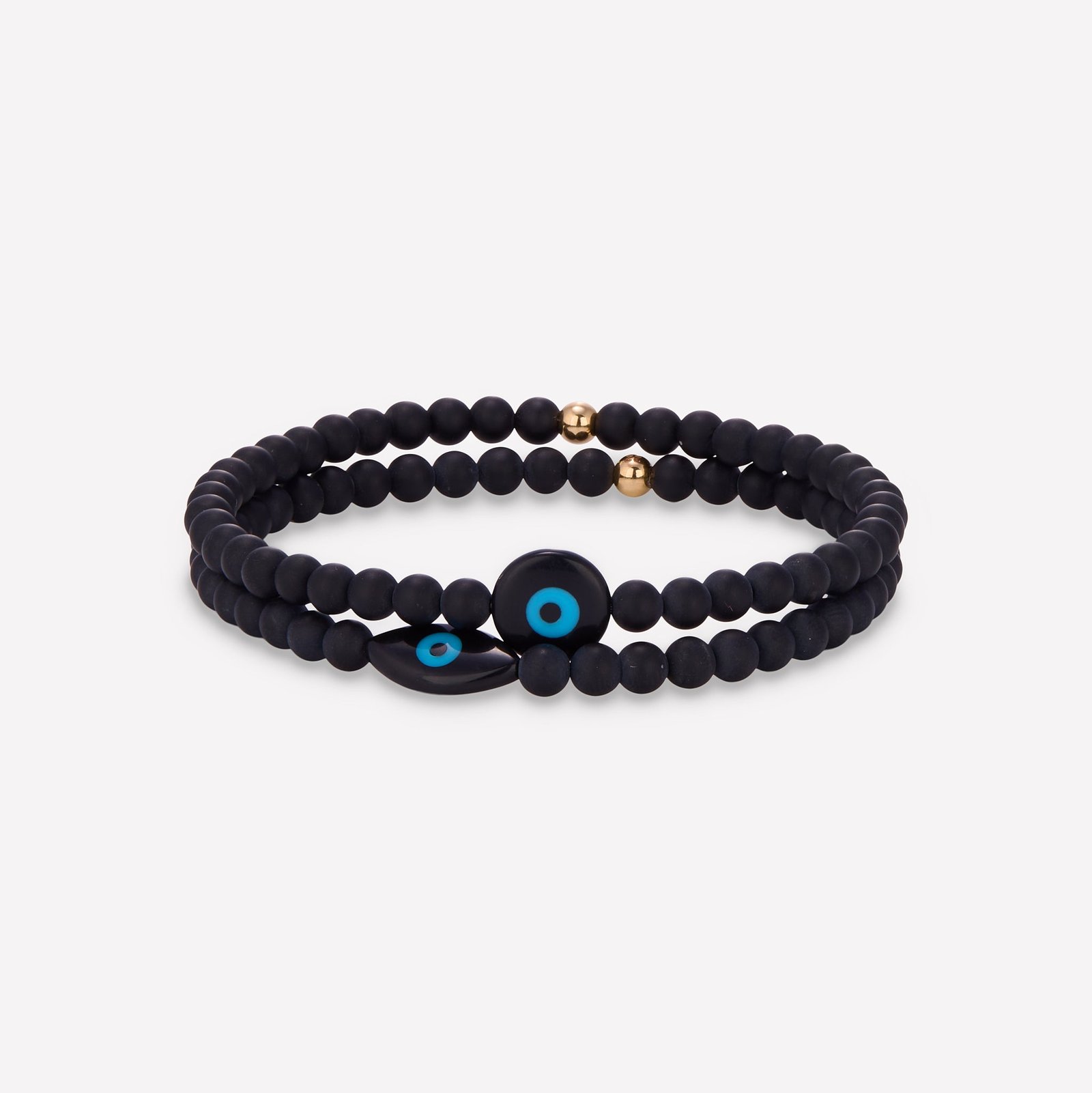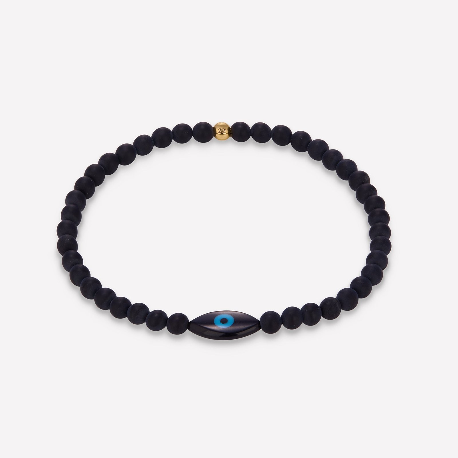 4MM beaded onyx bracelet with black evil eye for men on clear elastic.