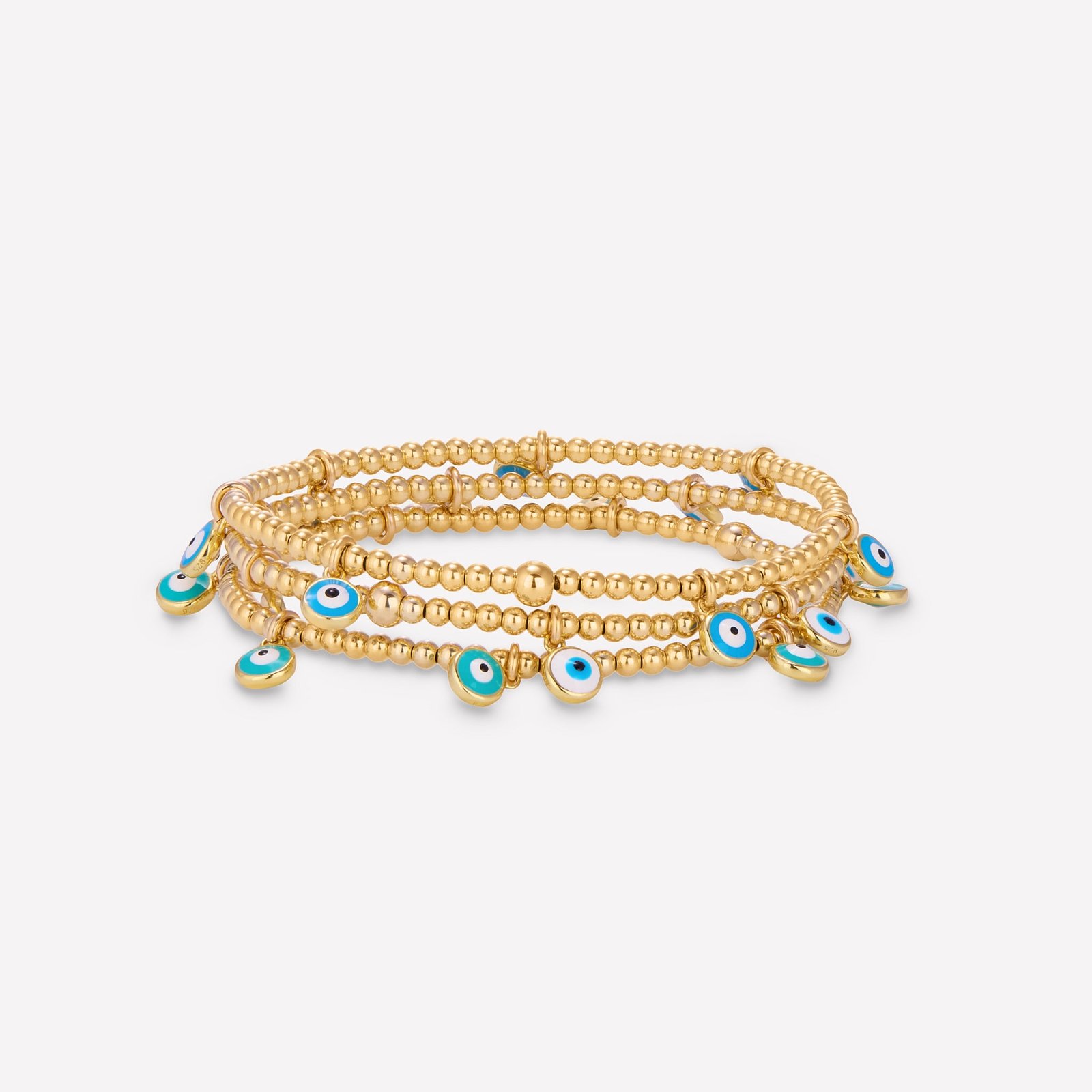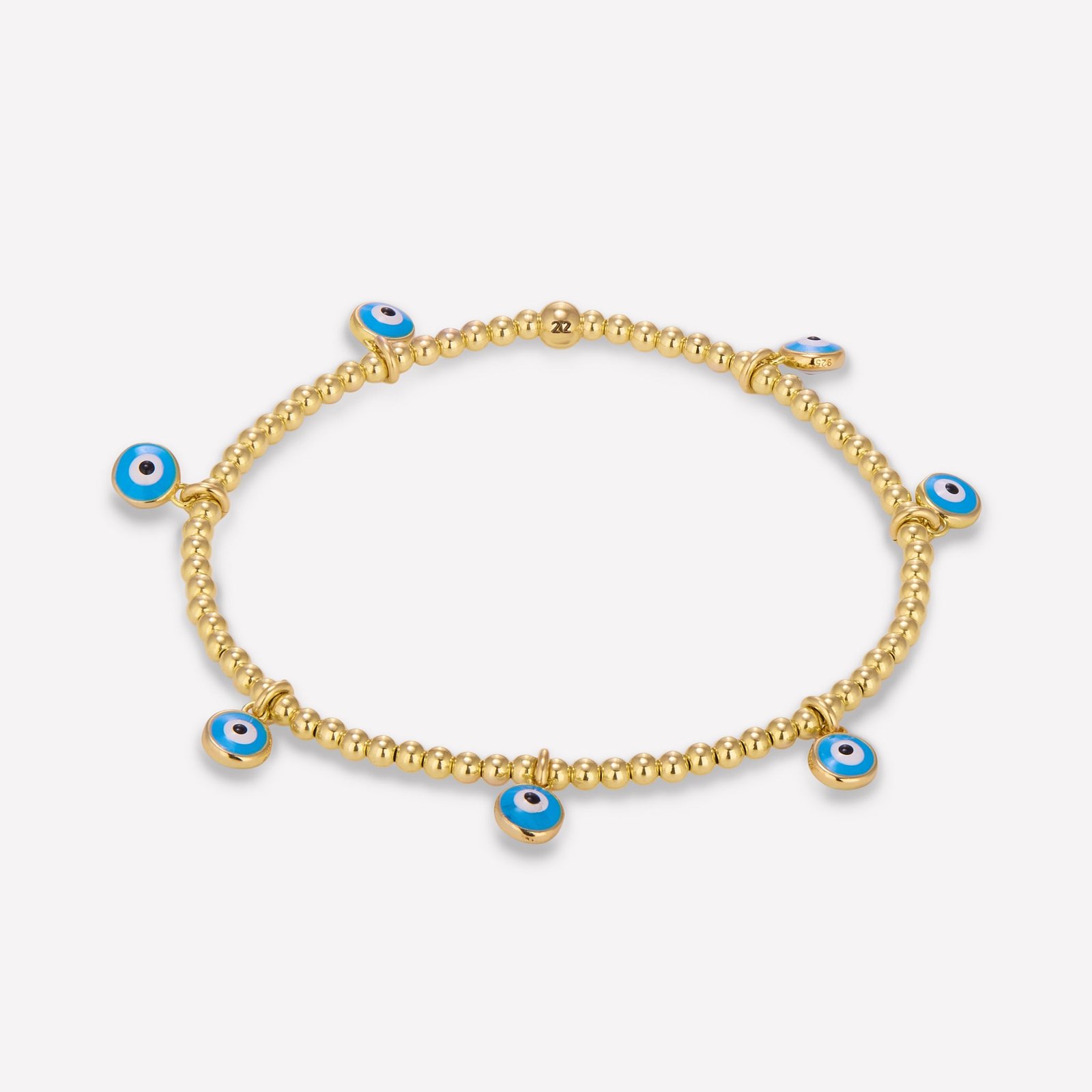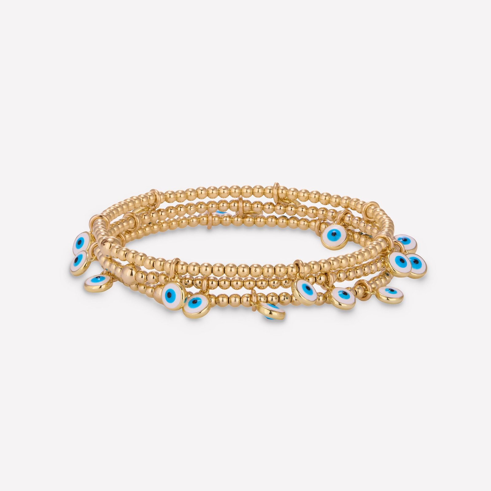 2MM 14K yellow gold bracelet for women with hanging evil eye charms  on clear elastic.