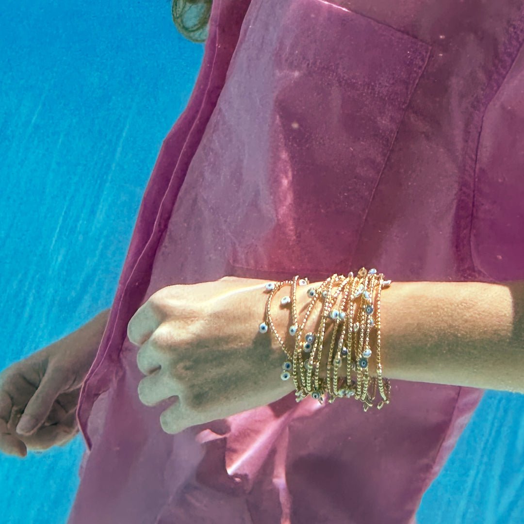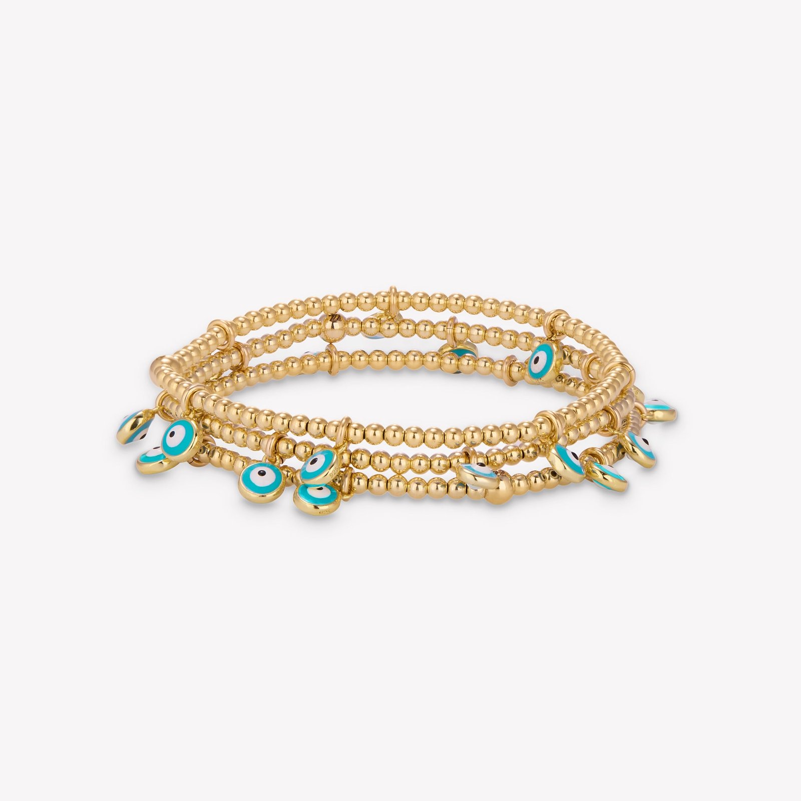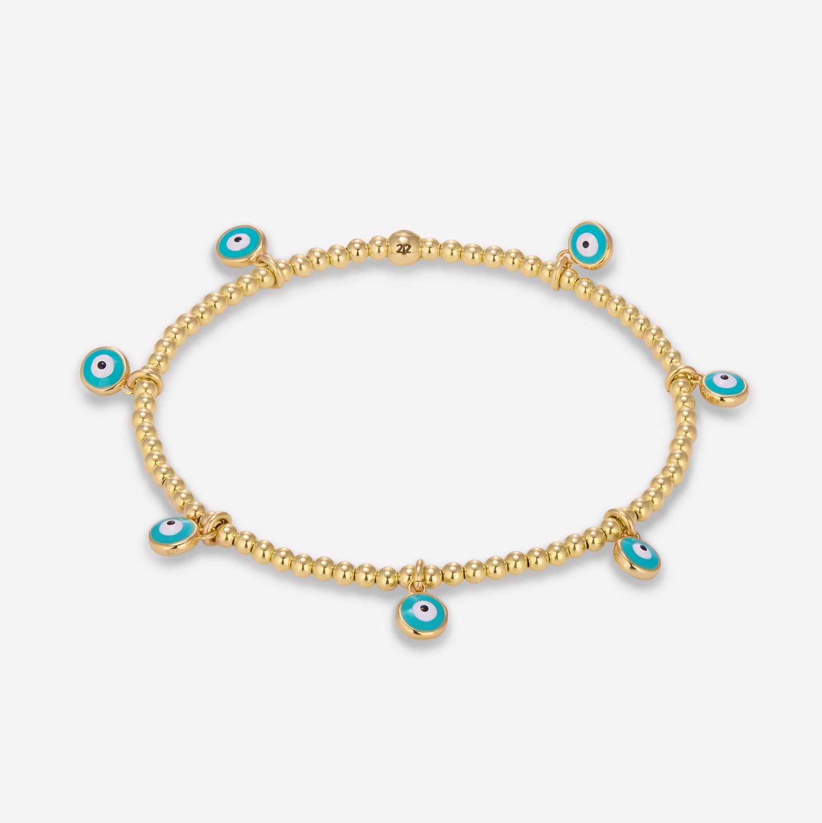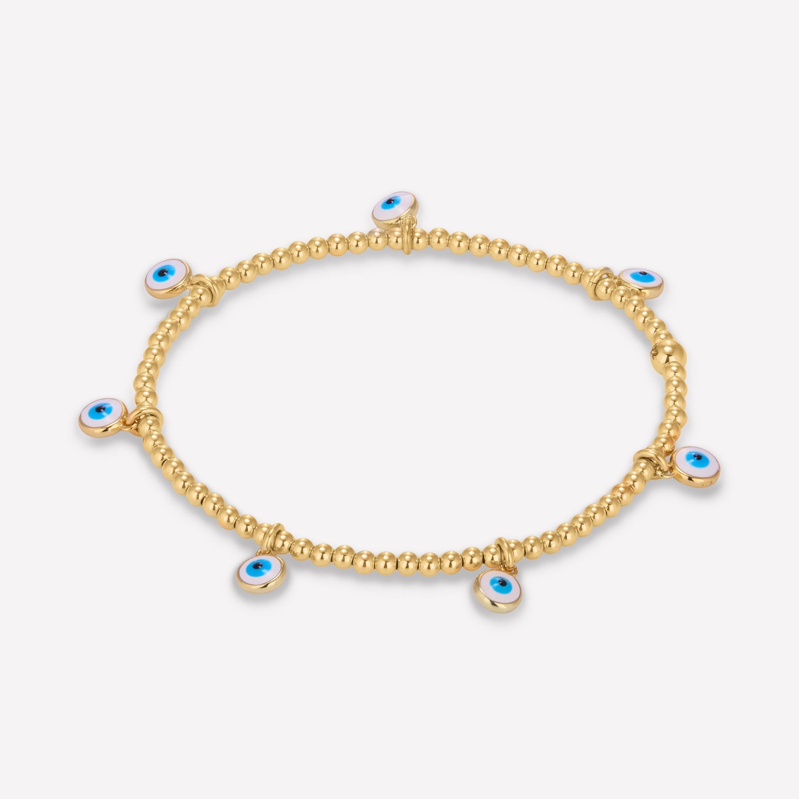 2MM 14K yellow gold bracelet for women with hanging evil eye charms  on clear elastic.